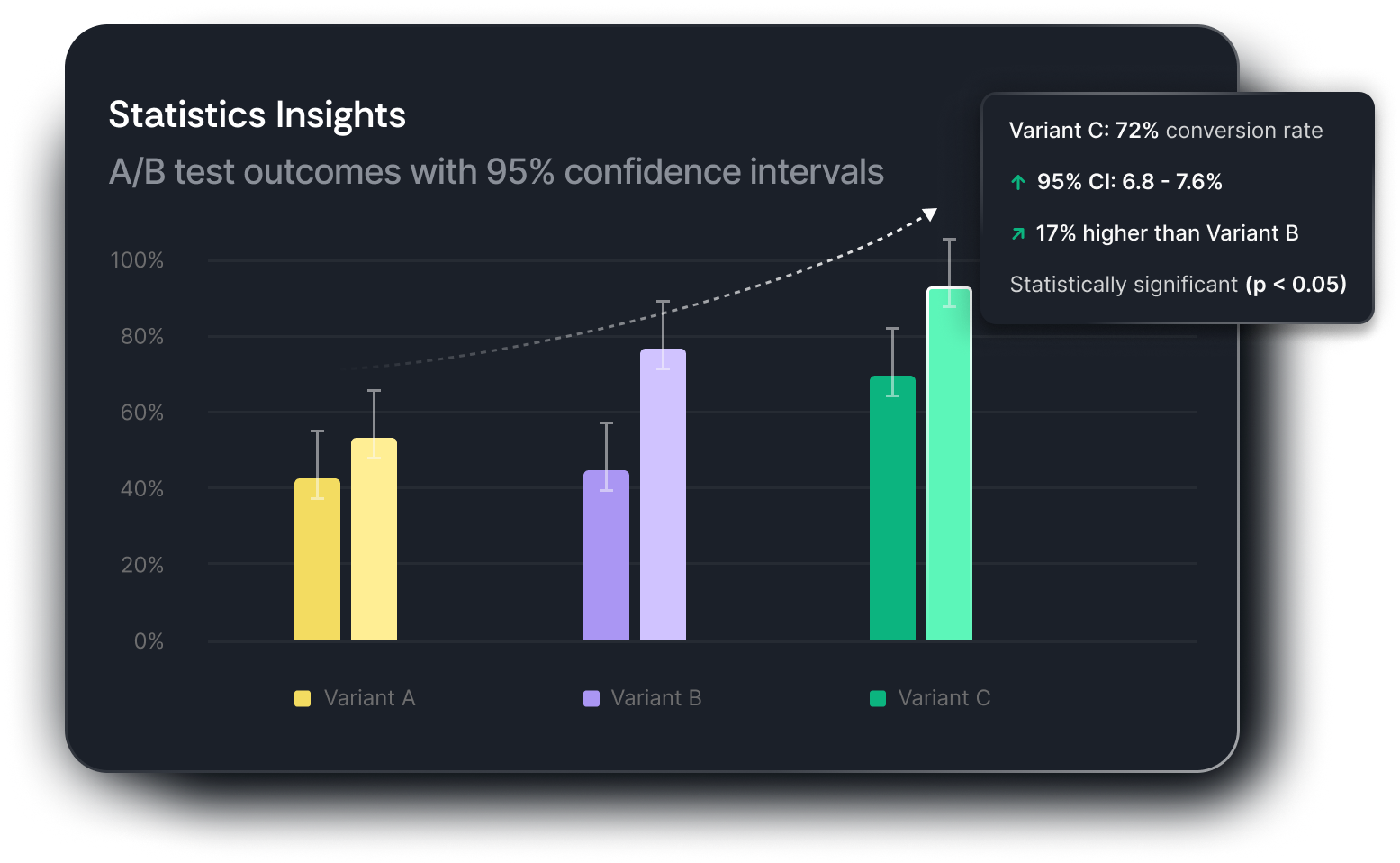 Make data-driven decisions with confidence using robust statistical tools to analyze experiment results. Get plain-English insights like “Variant B will likely increase Q4 revenue by $227K.”